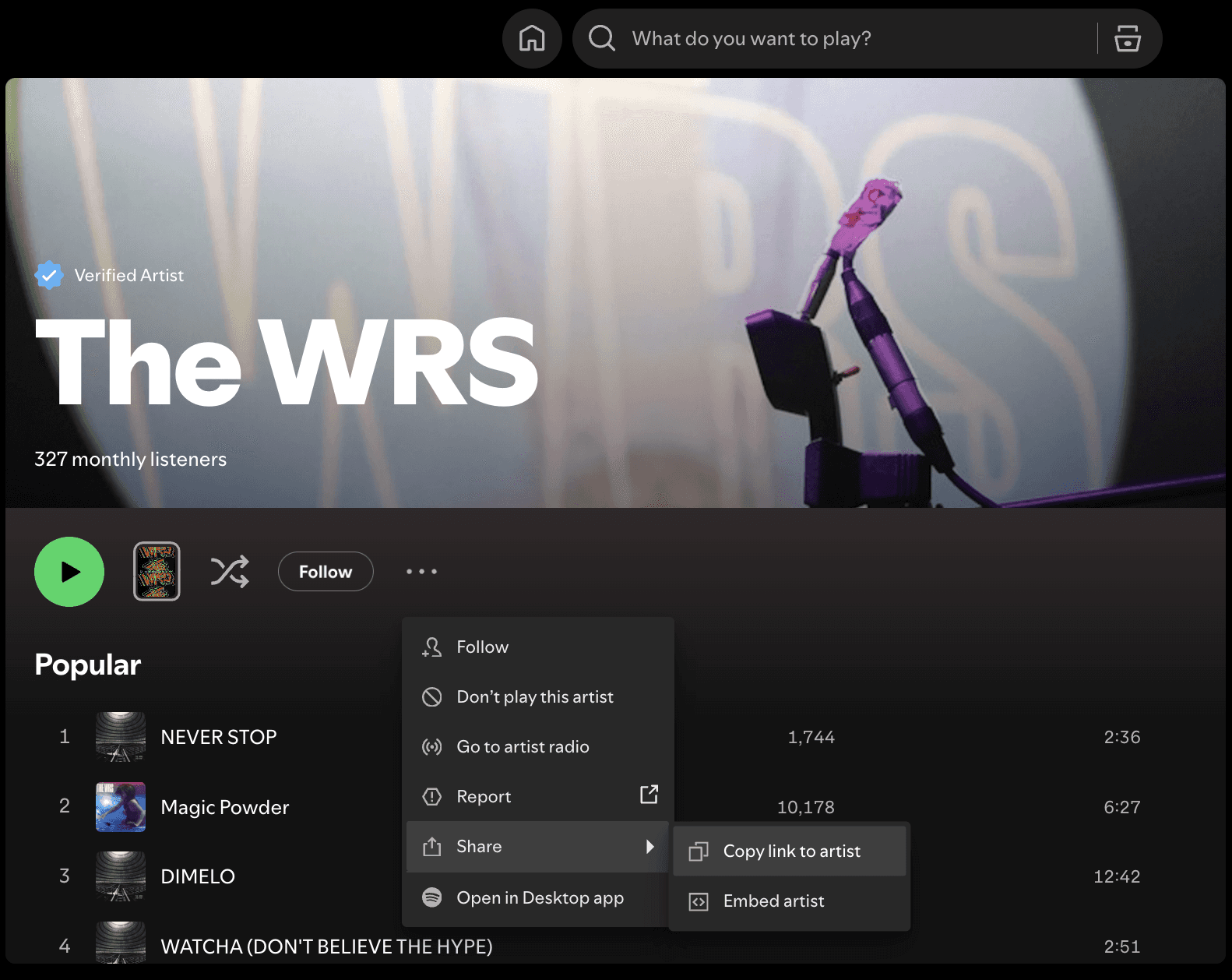 Cliquez simplement sur les trois points à côté de votre nom d’artiste, sélectionnez « Partager », puis « Copier le lien de l’artiste ».
